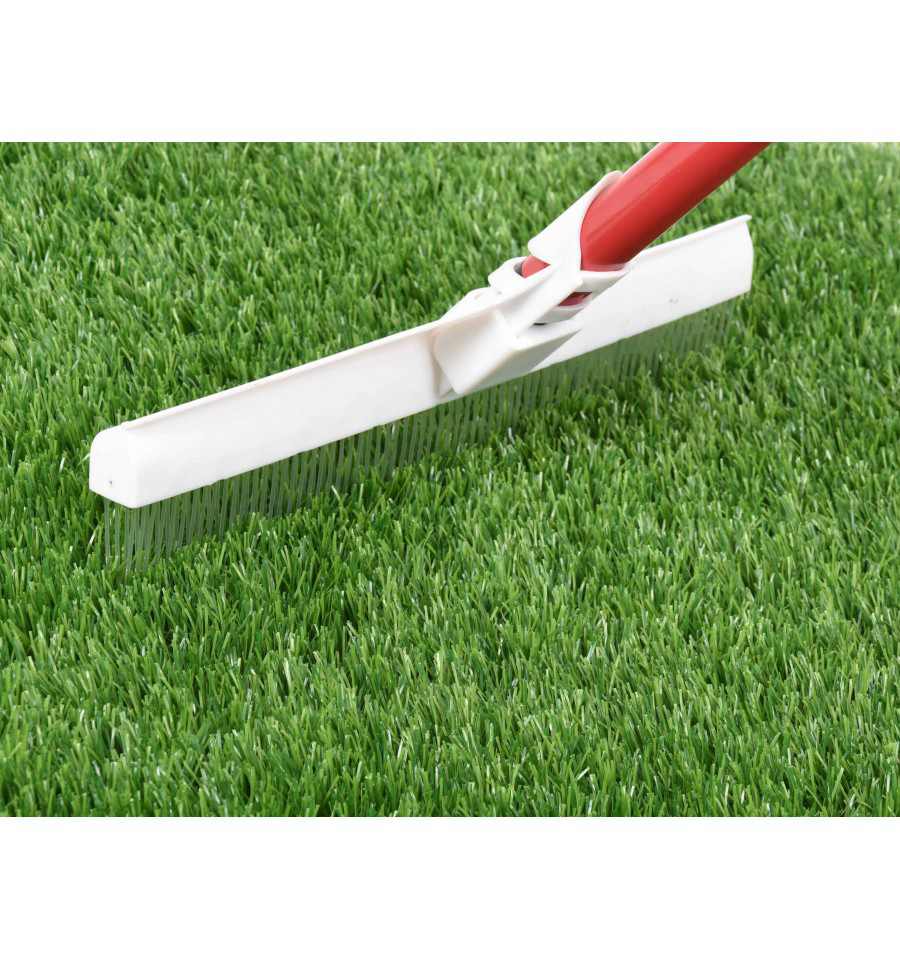 Cepillo para peinar césped, Cepillo de cerdas artificiales duras con el cual realizamos el proceso de peinado del césped artificial. Cepillando a contra-dirección hacemos que el césped quede erguido y conseguimos un aspecto más natural y llamativo. Este proceso de cepillado también permite eliminar la posible suciedad que haya quedado en la superficie. Características: Los materiales que lo componen son de gran calidad, por lo que es un cepillo muy resistente y con gran durabilidad. Cepillo de PVC blanco con cerdas de fibra de Nylon y mango metalico desmontable rojo. Las dimensiones adaptables a cualquier espacio. Mocho de 30,5 cm de ancho (cerdas con 4 cm y base de 7 cm de alto). Longitud máxima del cepillo 137 cm