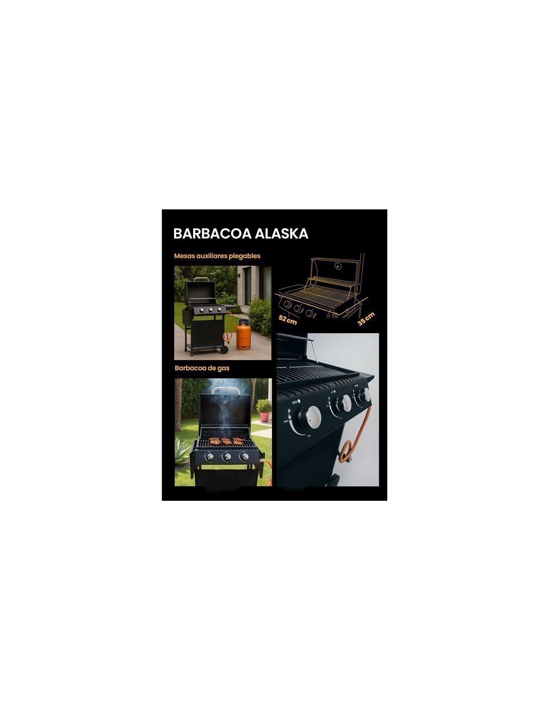 Estructura sólida preparada para uso en exteriores, fácil de limpiar y mantener. Incluye regulador y manguera homologada para una conexión segura a bombona de gas.