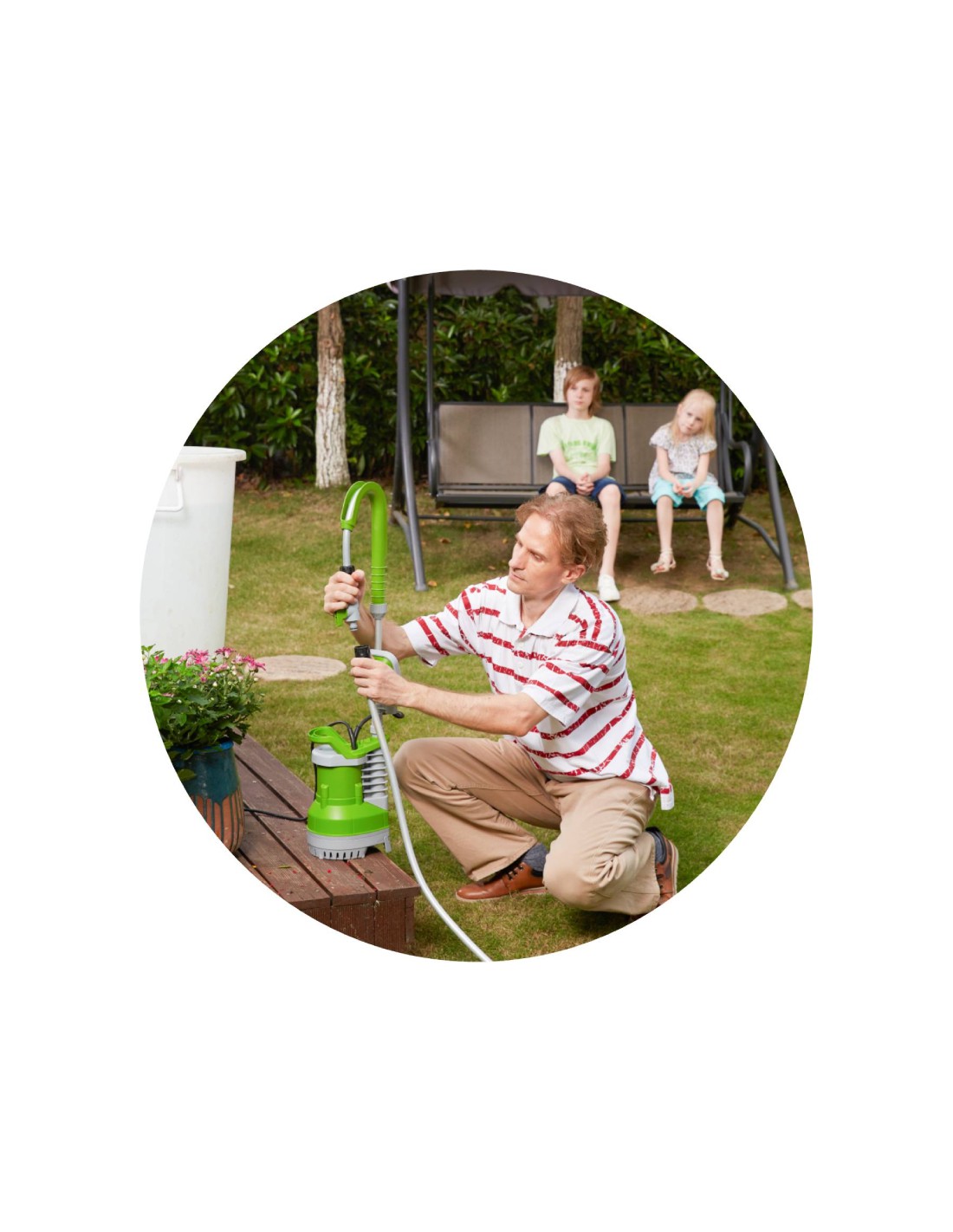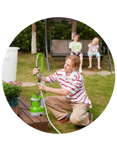Viene con un tubo flexible y un acople rápido con grifo que se adapta fácilmente a una manguera. También cuenta con un flotador interno incorporado.