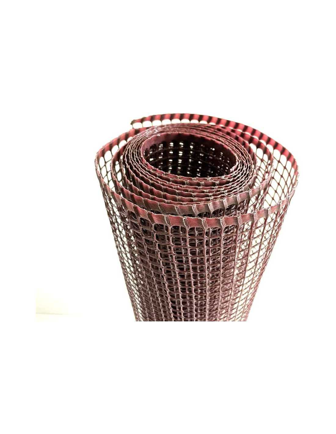 Malha plástica para jardinagem ou recinto marrom feito de polietileno com quadrados de diferentes tamanhos.